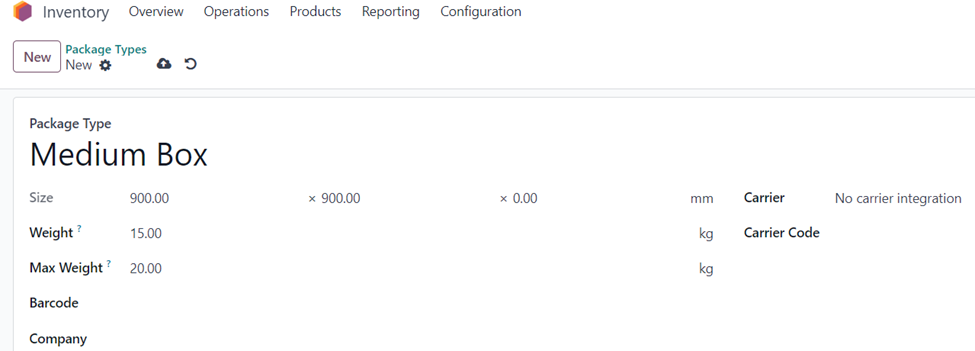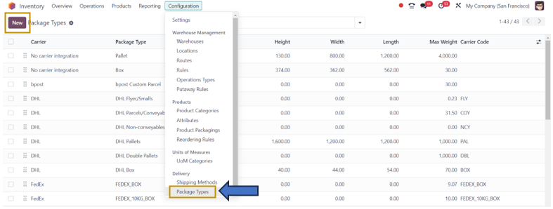 Inventory App => Configuration Menu => Delivery Section =>Package Types => New