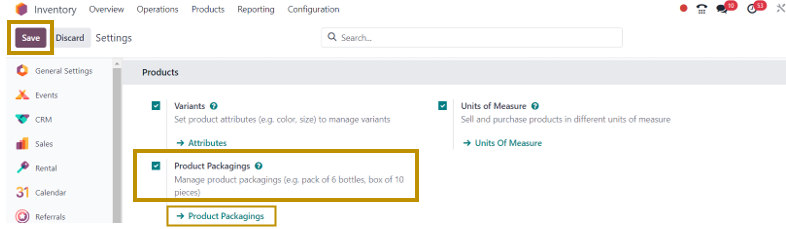 Inventory Application => Configuration Menu => Settings => Products Section =>Product Packagings => Save