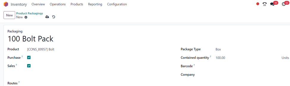 Inventory App =>Configuration Menu =>Products Section =>Product Packagings => New