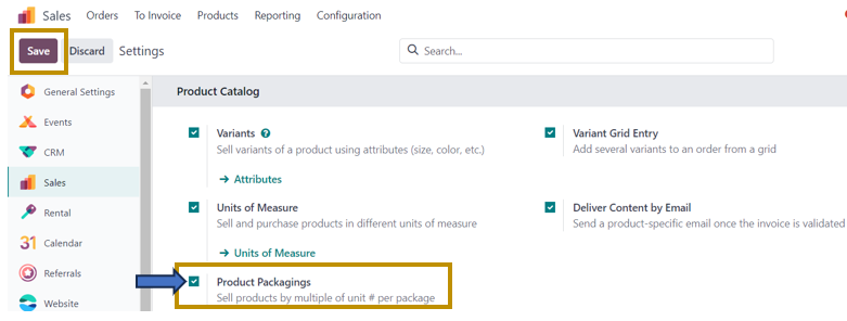 Sales App => Configuration Menu => Settings =>Product Catalog Section => Product Packagings =>Save