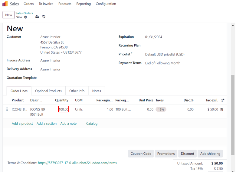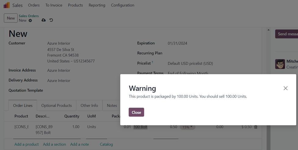 The quantity of Bolt in the sales order is 1. As we have selected the Product Packaging ‘100 Bolt Pack’, the required quantity in the pack is 100. A warning pop-up window appears indicating we have to sell 100 units of the Bolt. So, let us change the quantity to 100.