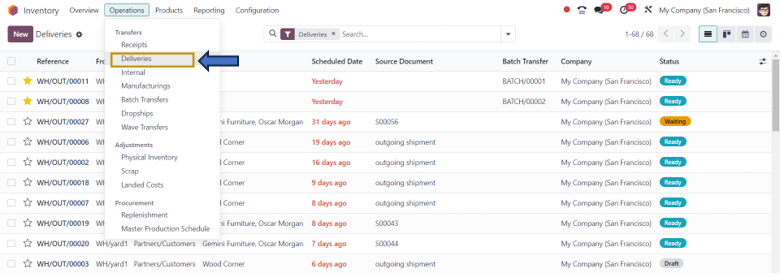 Inventory App => Operations Menu => Transfers Section => Deliveries