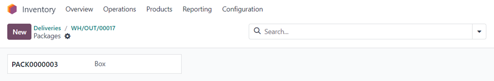 After activating the ‘Packages’ option in the settings, we can find the Packages option in the Products menu of the Inventory module. Select the ‘New’ option in the window to create a new package.