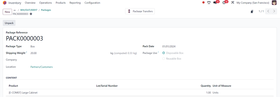 On selecting the ‘Packages’ smart button, the Package associated with the delivery order is shown as in the screenshot above. Here, ‘PACK0000003’ contains the product, Large Cabinet which is specified in the delivery order.