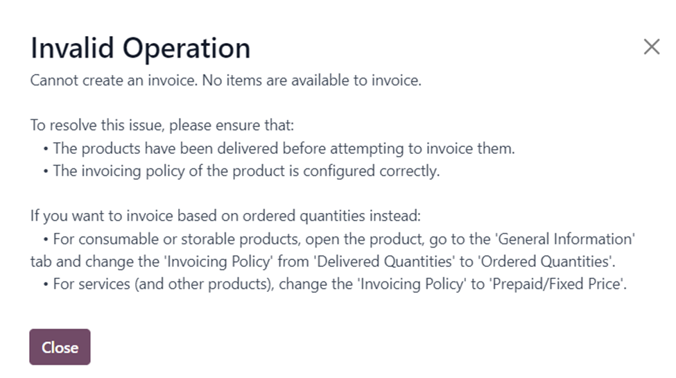 An error message appears. This is because we can only create an invoice after the product is delivered to the customer. For that, we need to go to the delivery order to validate and apply the quantity of the delivery order. So, select the ‘Delivery’ smart button on the top-right side of the order form to access the delivery order.