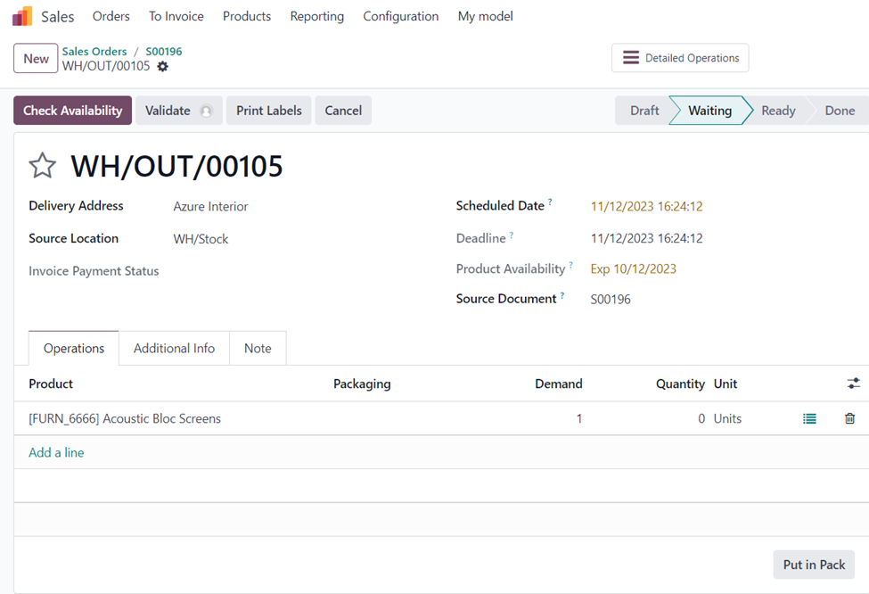 Select the customer and the product, Acoustic Bloc Screens in the ‘Order Lines’ tab of the order. By selecting the ‘Confirm’ button, we can confirm the order.