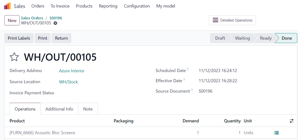 After applying the done quantity, you may note that the number in the ‘Demand’ column and the ‘Quantity’ column will be the same in the ‘Operations’ tab. On going back to the sales order, we can now create a new invoice for the order as the delivery order is in the ‘Done’ stage.