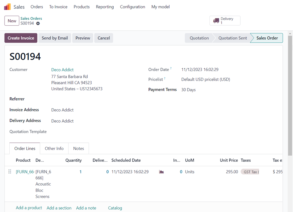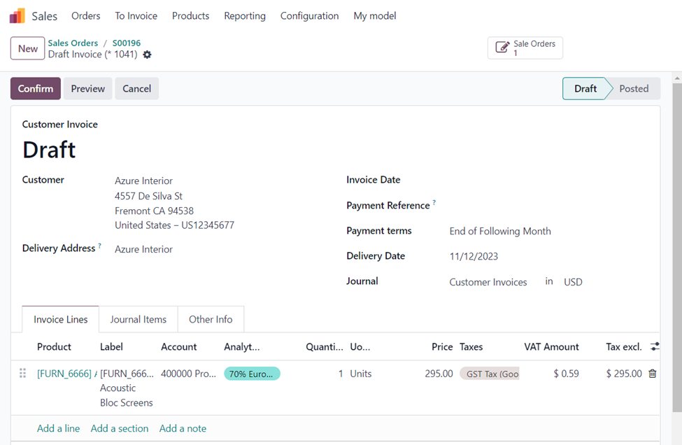 Follow the usual steps for creating an invoice for the order. The above screenshot shows the draft invoice created after the delivery of the product to the customer.