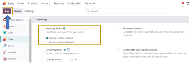 Before creating a sales order and its invoice, we have to set up an invoice policy in the Settings of the Sales Application.
