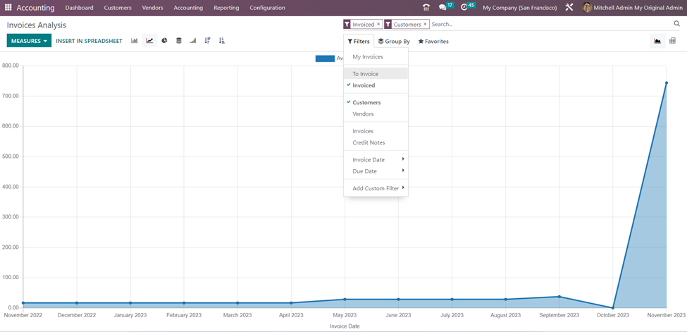 Accounting Application => Reporting menu => Management section => Invoice Analysis