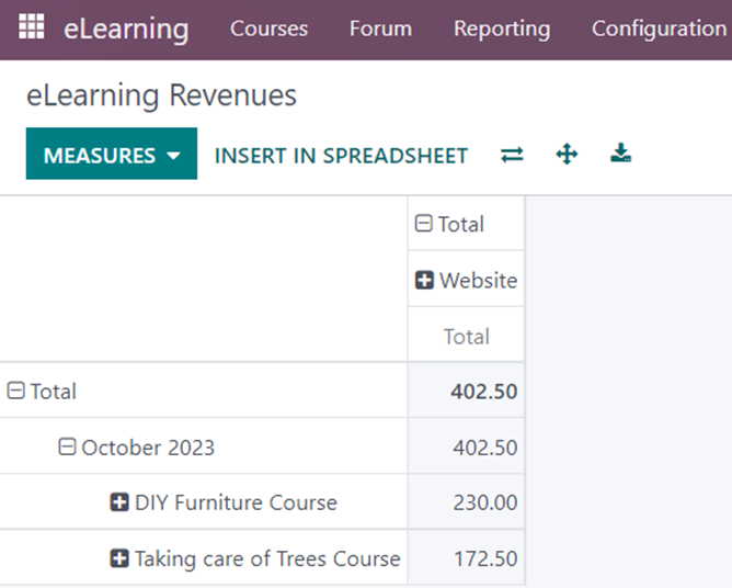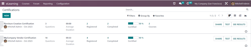 The ‘E-learning’ module homepage displays all the courses created along with the topic tags, number of reviews, views, published contents, attendees, finished or certified contents, and duration. We can use ‘filters’ and ‘group by’ options to access the required courses from a wide range of courses created. In addition to that, we can also change the view of the page from Kanban to list view. If you select the ‘View Course’ option, you can directly edit and access the course contents of the course in which you have enrolled. We also have the option to create a new course by selecting the ‘New’ button on the ‘All Courses’ page.