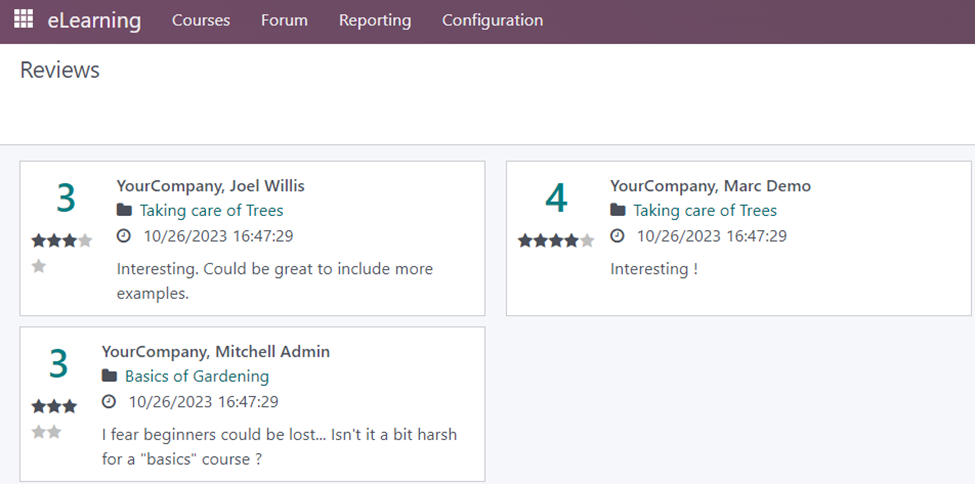 The ‘Reviews’ option shows all the reviews and ratings received for all courses along with the date and time of the review posted. We can also set the visibility of the review posted. Thus, ensuring that accurate feedback is obtained at the right destinations for every course.