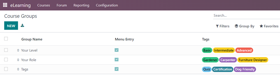We can classify the courses based on different criteria and group the courses by using the ‘Course Groups’ option as you can see in the above image. The tags mentioned in the image can be created and configured in the Odoo e-learning system by selecting the ‘Content Tags’ option and clicking on the ‘New’ button.