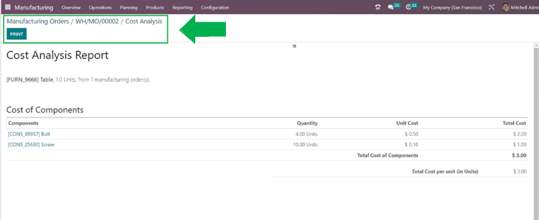 By clicking the ‘Cost Analysis’ smart button on the Manufacturing Order configuration form, you can obtain details and a report on the expenses associated with different parts and components utilized in the manufacturing of that particular Manufacturing Order.