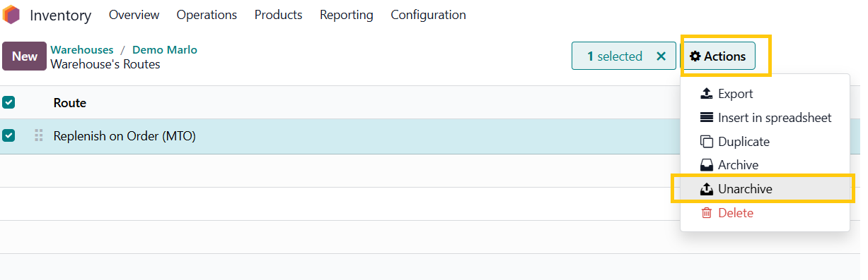 Go to Inventory App → Configuration → Warehouses → Select warehouse → Routes