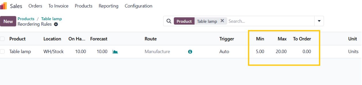 For example, the on-hand quantity of the product Table Lamp is 10. When you create a Sales Order for 8 units, the available stock reduces to 2, which is below the defined minimum level of 5.
