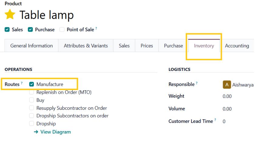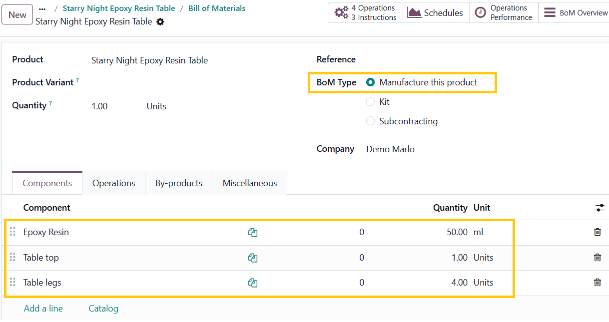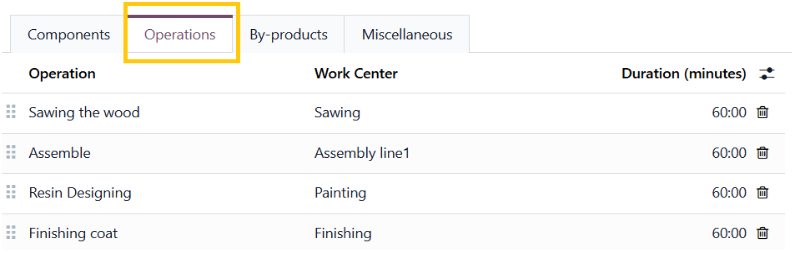 Navigate to the product page and select Bill of Materials , confirm that the BoM includes all necessary manufacturing operations and accurately assign these operations to the appropriate work centers to facilitate precise production planning and execution.