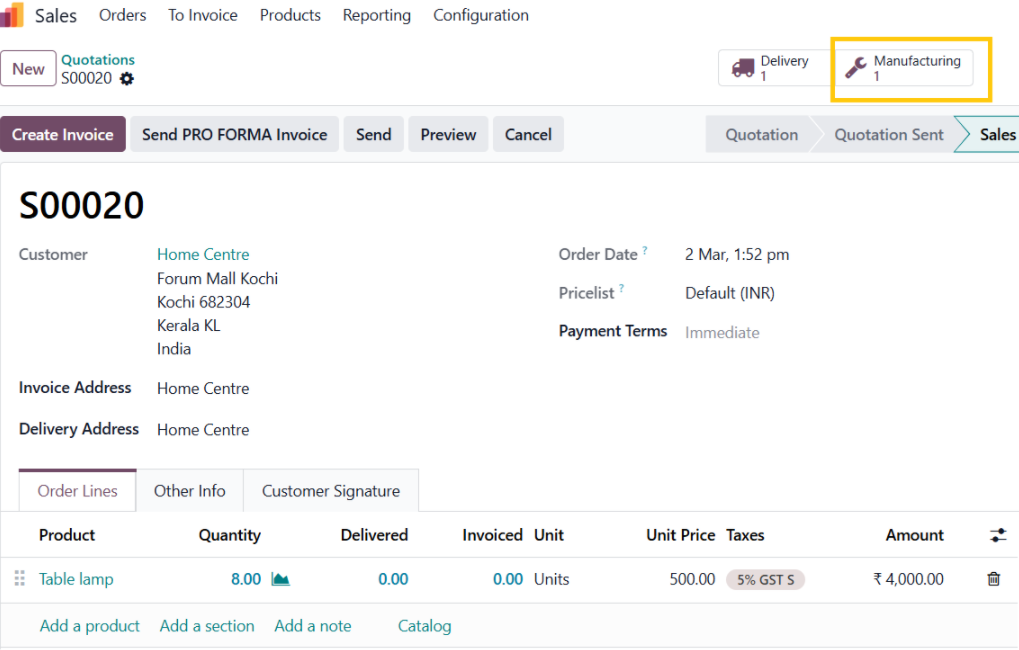 Return to the Sales Order and click on the Delivery smart button; it displays the Delivery Order created to transfer the finished product from the Stock location to the Customer