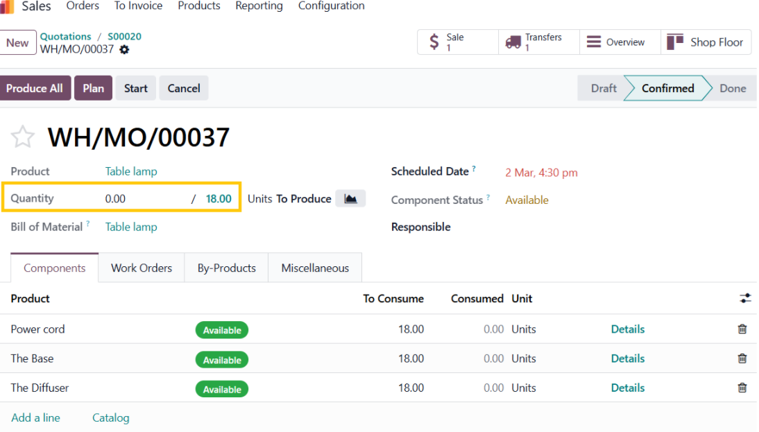 This triggers the reordering rule, and since the route specifies Manufacture, the system automatically creates a Manufacturing Order for 18 units to replenish the stock to the maximum level of 20.