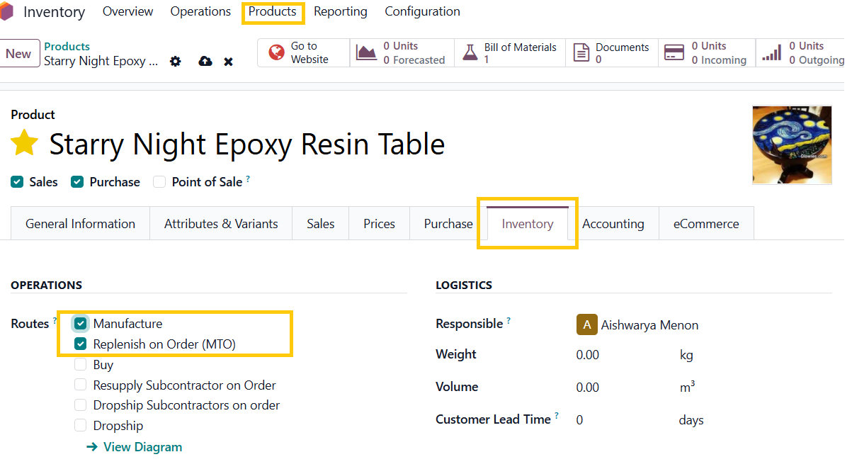 Go to Product → Products → Select the product → Inventory Tab