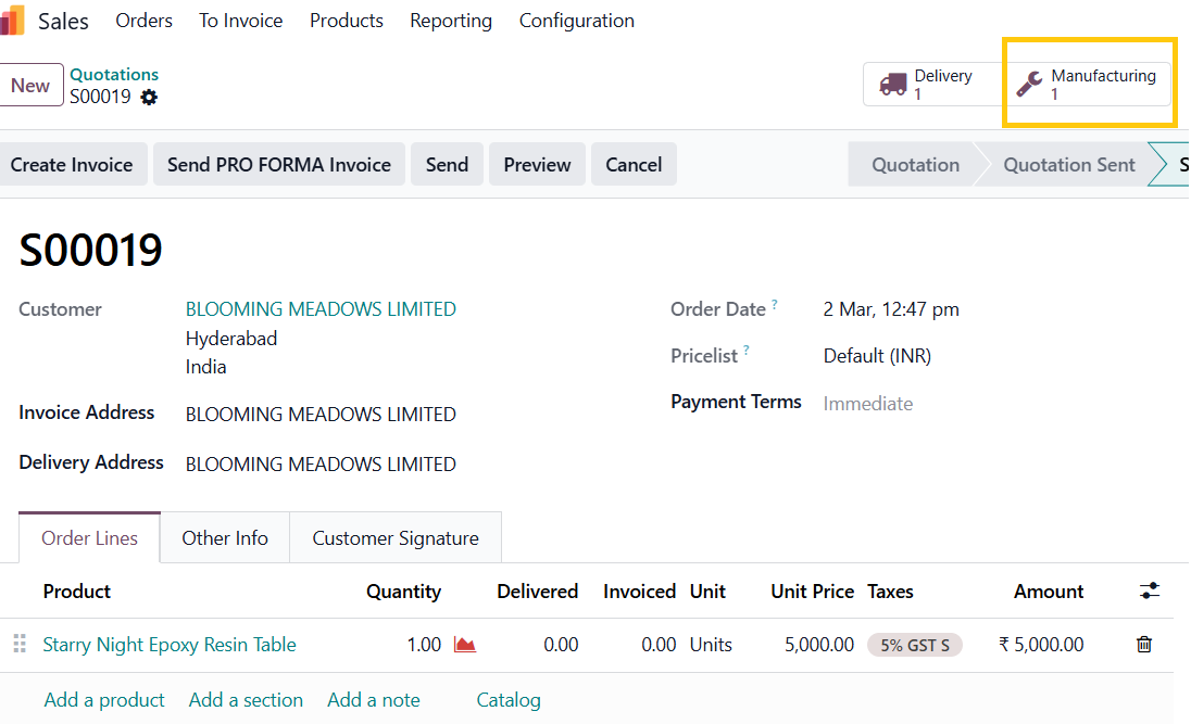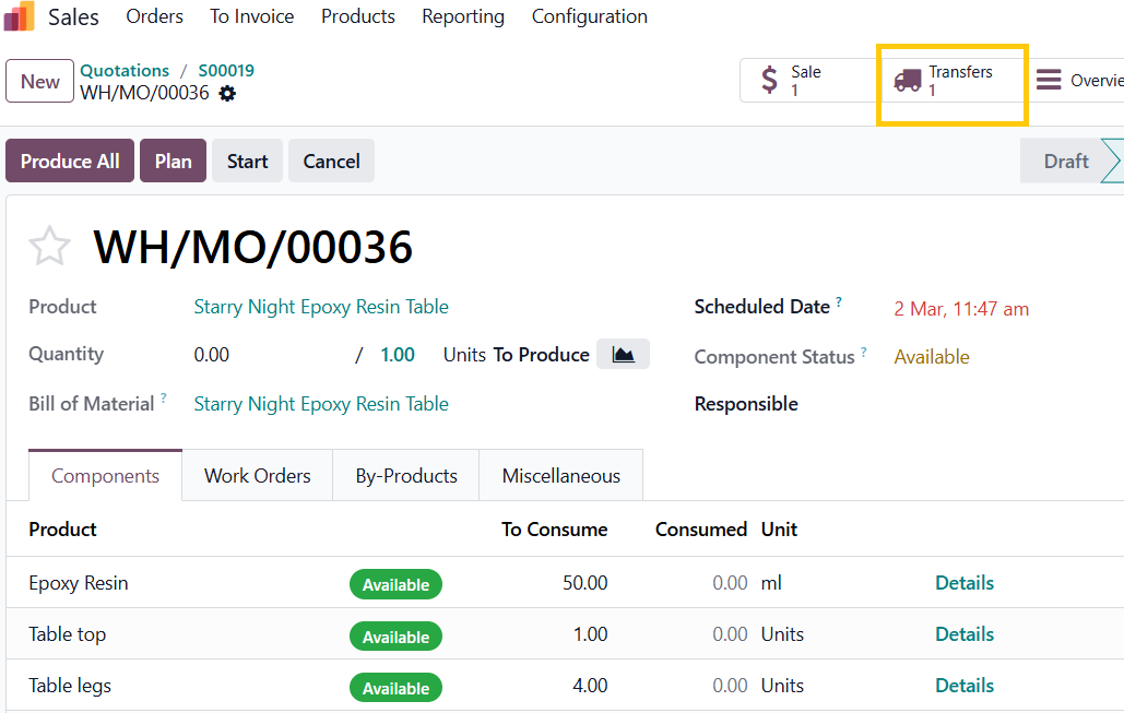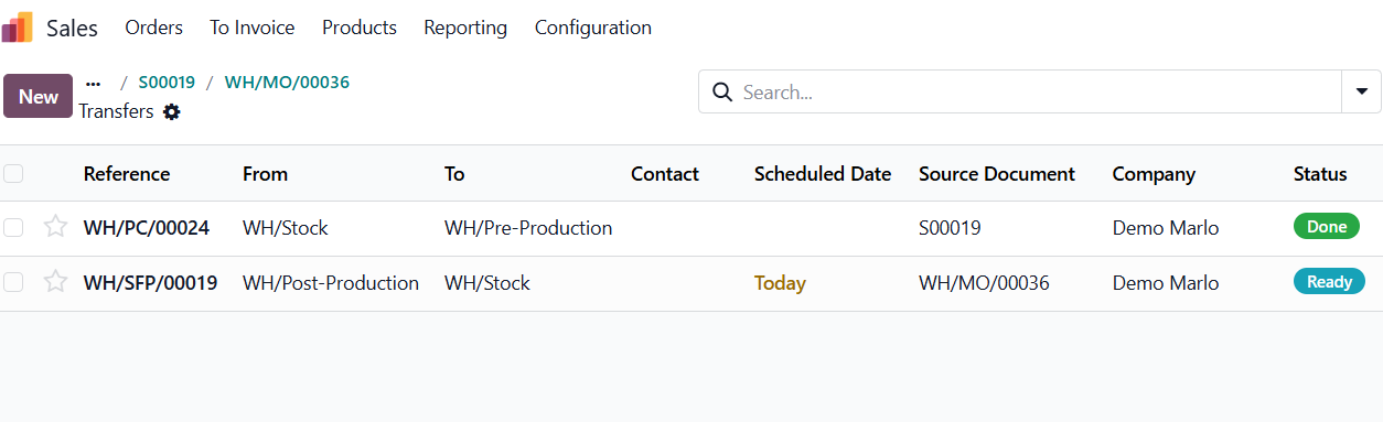 Upon confirming the Sales Order, the system automatically generates a Manufacturing Order, and within it, creates a transfer operation to move the required raw materials from Stock to the Pre-Production location, (3-step manufacturing configuration)