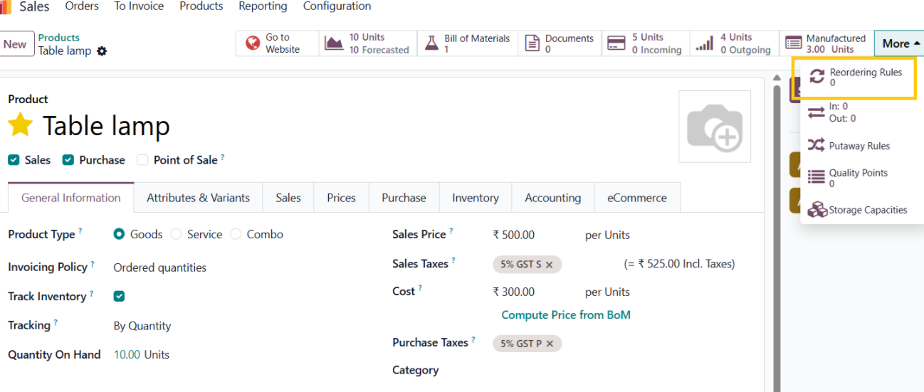 Product → More → Reordering Rules