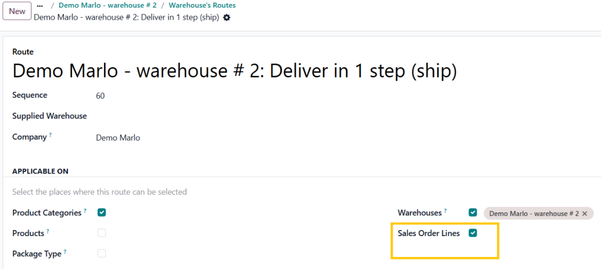 Routes –> Warehouse 2 Deliver in One Step (ship), and enable Sales Order Lines: