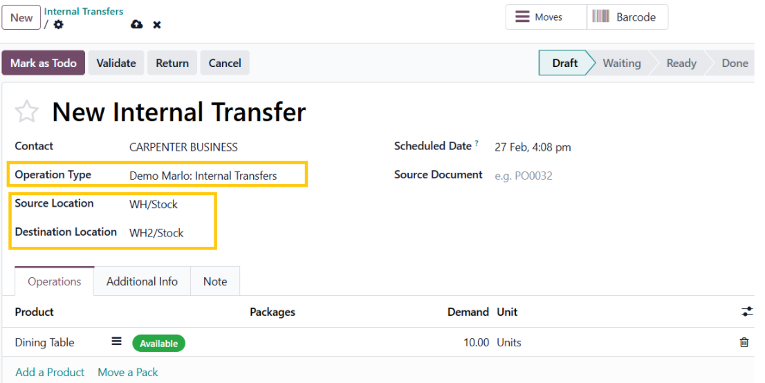 Set the operation type to Internal Transfer and verify that the source and destination locations are correct. Then click Mark as To Do and Validate.