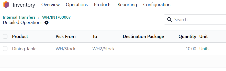 To view the detailed movement of stock, click on the Moves icon at the top. This displays all the individual stock moves associated with the transfer.