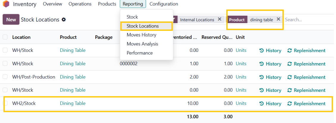 Navigate to Reporting → Stock Locations and apply a filter for the required product. Odoo displays the available quantity across all warehouse locations.