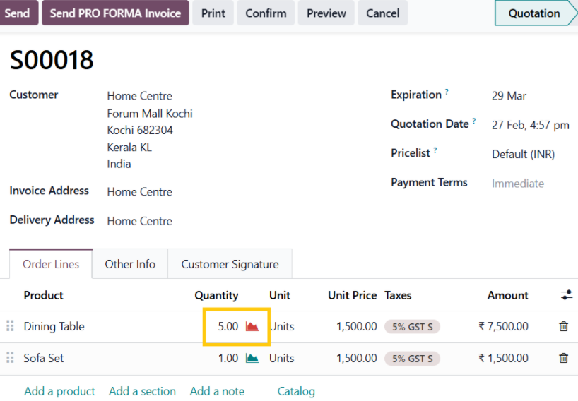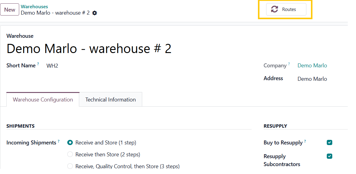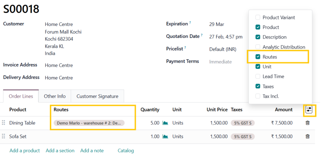 In the Routes column, select the new warehouse and click Save. The forecast indicator turns green, showing that the required quantity is now available. You can then confirm the sales order.