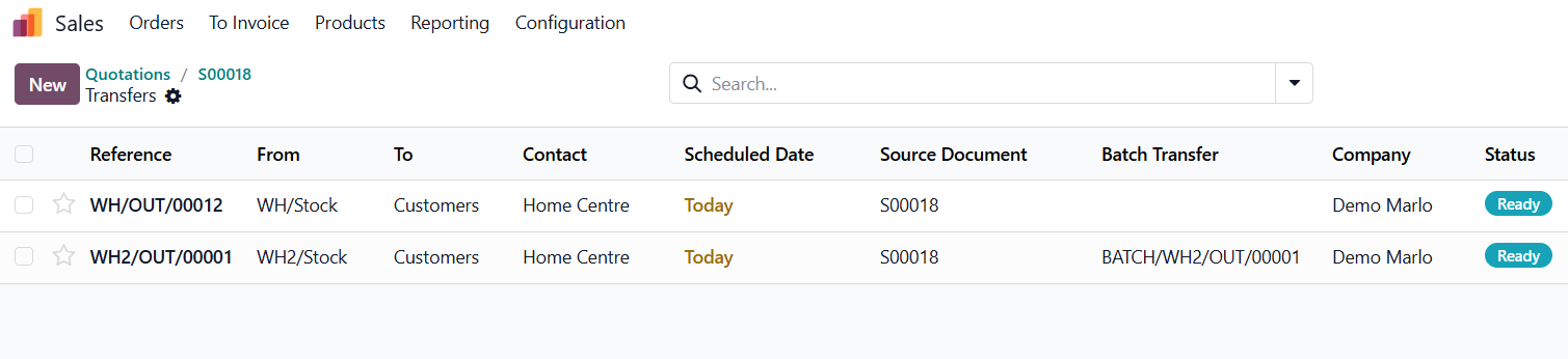 When you click the Delivery icon, Odoo automatically generates two delivery orders.