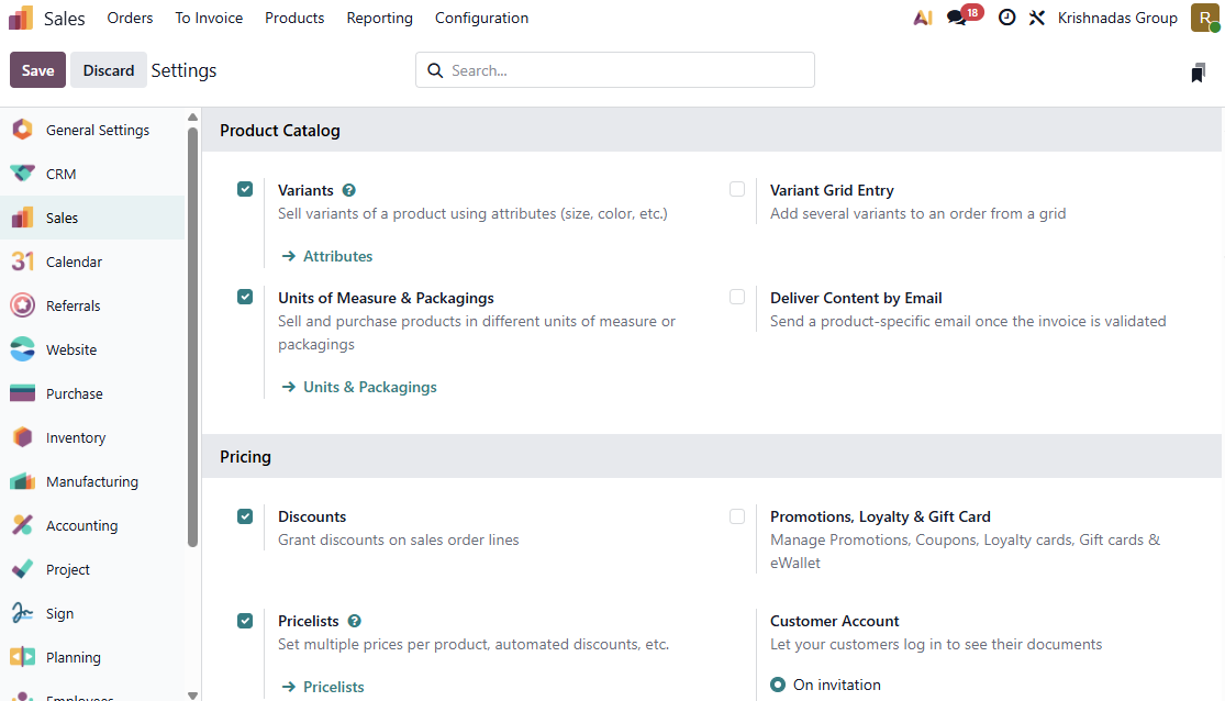 Enable the Pricelists checkbox. This unlocks the menu at Sales → Products → Pricelists. Also enable the Discounts checkbox. This adds a Disc.% column to sales order lines.